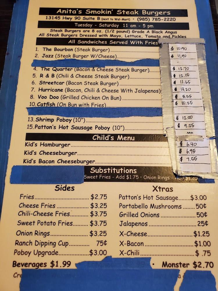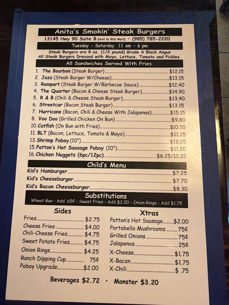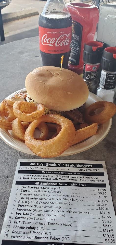 Welcome to Anita's Smokin Steak Burgers, your go-to spot for mouthwatering burgers in Boutte, LA! Located at 13145 US-90, we offer a relaxed and trendy atmosphere perfect for a quick lunch, an intimate dinner, or a solo meal. Enjoy our deliciously crafted steak burgers, accompanied by crispy fries and a selection of shareable appetizers. With amenities like outdoor seating, takeout, and delivery, we cater to all your cravings. Our venue is wheelchair accessible and family-friendly, ensuring everyone can savor our tasty offerings. Stop by or call us at +1 985-785-2220 for a delightful dining experience!